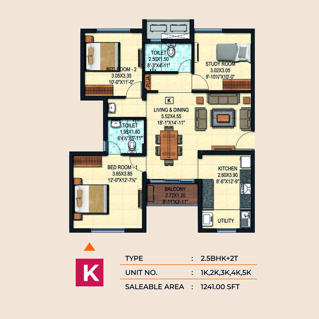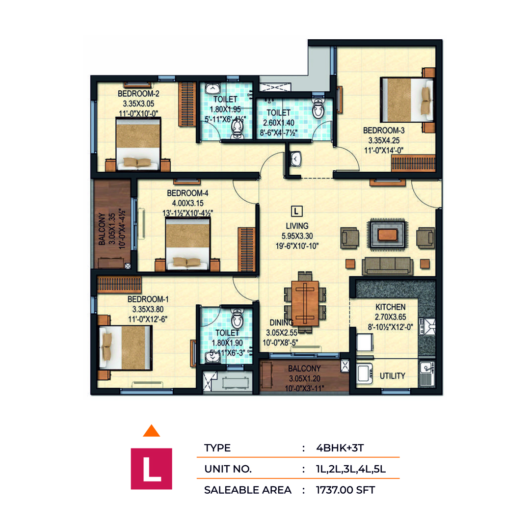 - Wood pattern tiles in Master bedroom & Kitchen. Vitrified tiles for Living, dining and the other bedrooms. Anti-skid tiles for Balcony, Utility & Toilets