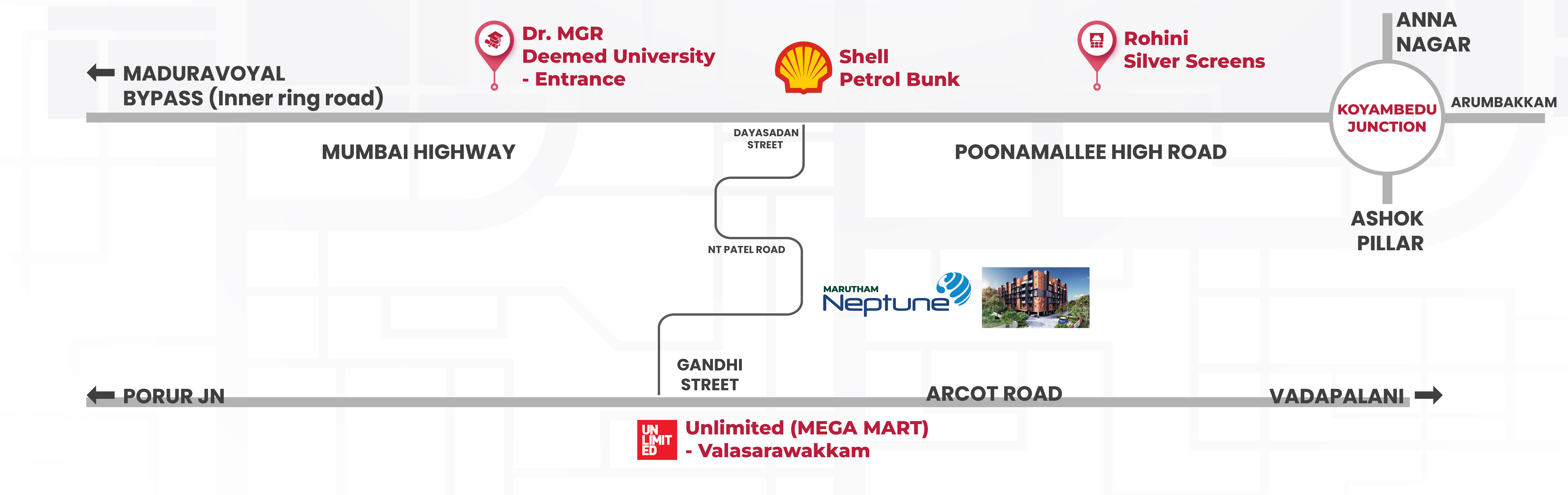 It is located in the vibrant hub of Koyambedu, just 2 km from Koyambedu Metro Station and 1 km from Valasaravakkam, Marutham Neptune offers seamless connectivity to Anna Nagar, Vadapalani, Ambattur, and Porur. It stands as a testament to Phase 1, with 120 happy families living in it.